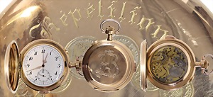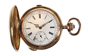 Schwere Herren-Taschenuhr, Schweiz um 1910, GG 585/000, weißes Emaille-Ziffernb., arab. Std. u. Min., kl. Sek. auf 6 Uhr, Repetition A MINUTES CHRONOGRAPHE; Werk mit Glasabdeckung, D = 58,1 mm, Sprungdeckel mit Monogramm: AB o. BA, total 108,7 g, Uhr läuft, dezente Tragespuren, guter Zustand !