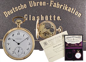 Goldene Herren-Taschenuhr aus der Uhrenfabrik A. LANGE & SÖHNE. Gekauft beim Hof-Uhrmacher u. Hoflieferant Seiner Königlichen Hoheit des Prinzen von Preußen, CONRAD FELSING BERLIN den 7. November 1916, Original Garantieschein liegt bei !! Taschenuhr gefertigt in GG 585/000, weißes Emaillezb. (sehr guter Zustand), arab. Index, sehr feine gebläute Lanzenformzeiger, Schwanenhals-Feinregulierung, Breguet Spirale, Kompensationsunruhe, gebl. Schrauben. Gehäuse Nr. 75715, Werk-Nr. 75715 Eine Orig. Schatulle aus dem Haus A. LANGE & SÖHNE, sowie eine originale Bestätigungskarte der DEUTSCHEN UHREN-FABRIKATION A.Lange & Söhne Glashütte b/ Dresden runden das Bild ab.