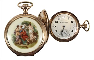 Herren-Taschenuhr um 1900/1910, HAMPDEN Watch Co, Doublé, weißes Emaille-Zifferblatt, arab. Zahlen, Minuten in rot abgesetzt, sehr feine gebl. Zeiger, kl. Sekunde auf 6 Uhr, Vollankerhemmung, geschr. Chattons, Werk aufwendig gestaltet, D = 47,1 mm, Porzellandekor später (um 1920/30), Uhr läuft !