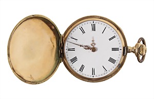 Zylinder-Taschenuhr um 1915, GG 585/000 (geprüft), weißes EZ-Blatt, röm. Zahlen, feine goldene Zeiger, Zwischenboden (Metall), aufwändig graviertes Gehäuse, zarte Emailleeinlagen, D = 32,8 mm, Uhr läuft nicht an, total 27,4 g