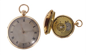 verge fob watch around 1800/1820, Gold 585/000 (tested), signed BOLLE A HONFLEUR, silver, fine guilloched clockface, Roman index, fine golden hand, key winding, several pieces on the back are fine engraved, with a diameter of c. 53.0 mm, total 109.2 g, clock is running, nice condition !! with key