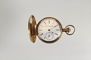 Herren-Taschenuhr, U.S.A. um 1880/90er Jahre, ELGIN NATL WATCH Co, GG 585/000, signiert, weißes Emaille Ziffernblatt, röm. Index, , kl. Sekunde auf 6 Uhr, Gehäuse seitlich, sowie beide Deckel aufwändig graviert, Zwischenbod. in GG 585/000, Kompensationsunruhe, gravierter Unruhkloben, signiertes Werk Nr° 6671082, D = 50,0 mm, sehr schöner Zustand, Uhr läuft ! total 104,3 g