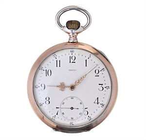 men's pocket watch around 1910/1920, silver 800/000, red-gold-plated, OMEGA, white enamel clockface, Arabic numbers, minutes in garland, very fine golden hand, small second on 6 o'clock, lever escapement, breguet hairspring, diameter = 52.1 mm, heavy produced 94.4 g, clock isn't running!