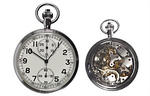 Swiss timekeeper and pocket watch, 1960s, steel, white enamel clockface, Arabic numbers hours and minutes, small second on 6 o'clock, stop function over the crown, inside small screwed compartment with replacement parts, diameter = 51.0 mm, unusual !