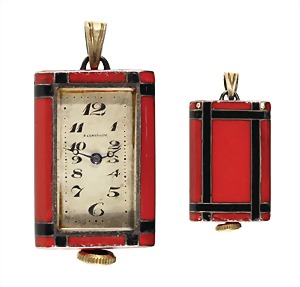 Damen Anhänger-Uhr, ART-DECO 1920/30er Jahre, JUVENIA MVG SWISS, SILBER 935/00, sig. À L´EMCERAUDE, MODEL DEPOSE N° 77693, Gehäuse rot und schwarz emailliert (kl. Chips, reverso kl. Fehlstellen), H = 40,0 mm, Uhr braucht Revision !