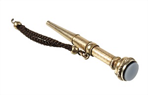 big fob watch key, c. from the mid 19th century, in the head a layer agate, fine worked out ornament, with ratch, height = 63.2 mm