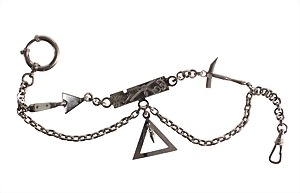 Taschenuhrenkette, JUGENDSTIL um 1900, Metall vernickelt, FREIMAURER, Kelle, Hammer, Winkeldreieck und Lot, doppelte Kette, L = ca. 30,0 cm, schöner Zustand !