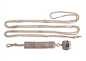Lot: Chattelaine und Uhrenkette um 1900, Doublé, Chattelaine mit einer Handtasche am Ende (sie dient als Medaillon), H = 14,5 mm; lange Tachenuhrenkette, L = 153,0 cm
