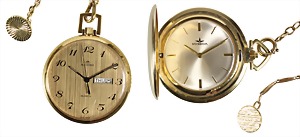lot: fob watches, 1 DUGENA, manual winding, 10 micron gold-plated, diameter = 42.5 mm, fob watch chain, yellow gold 585/000, lenght = 40.0 cm, total 10,6 g, 1 clock, BUCHERER, quartz, day, date, diameter = 43.1 mm, fob watch chain, both gilded