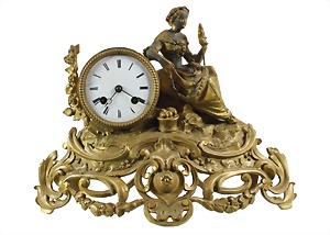 Französische Pendule um 1870/80, Bronce vergoldet, weißes Emaille-Zifferblatt (feine Risse), röm. Zahlen, ½ Std. Schlag auf Glocke, Dame in Tracht, zu Füßen ein Korb mit Wolle, eine Spindel in der Hand haltend, mit floralem Dekor ornamentiert, ca. 33,5 x 22,5 cm, ungeprüft !