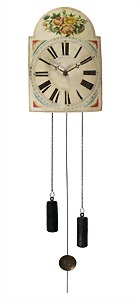 Schwarzwald-Schilderuhr 2.Hälfte 19.Jhd., bemaltes Holzschild, Blumenmotiv, röm. Zahlen, 1/2 Std. Schlag auf Glocke, 24 x 34,5 cm, ungeprüft !