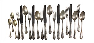 20 pieces cutlery, silver 800/000, signed SCHLUND, floral textured on both sides, monogrammed on the back : AS, 5 forks, 5 knives lenght = 21.5 cm, 6 spoons and 3 coffee spoons, total 536 g (without knives !)