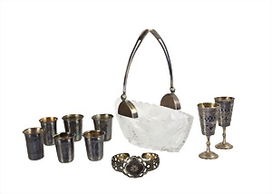 Lot: Russisches Silber, 6 Becher 1908/17, 4 Stck. D = 34,0 mm, H = 42,0-46,5 mm, 2 Stck. D = ca. 41,0 mm, H = ca. 44,4 mm (84 Zolotnik); 2 Becher mit Stil, Niello, D = 34,0 mm, H = 83,0 mm, 8 Becher total 182,0 g; 1 Bonboniere 1920/30er Jahre, Silber 875/000, sig. Hammer und Sichel im Stern, Bleikristall (graviert), ca. 21,5 x 10,5 x 16,0 cm, Henkel mit Scharnier; 1 Armreif/Spange, Silber 875/000, sig. Hammer und Sichel im Stern, graviert, durchbrochen gearbeitet, innen ca. 63,3 x 57,0 mm