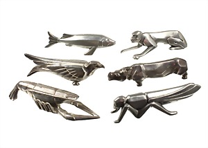 6 Messerbänke, Frankreich, ART-DECO 1929/30er Jahre, Metall versilbert (berieben), verschiedene Tiere: Nashorn, Hummer/Krebs, Fisch, Heuschrecke, Affe u. Greifvogel, L = 8,6 - 10,4 cm
