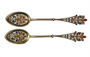 two mocca spoons around 1900, silver 850/000 gilded, colored translucent enamel (blique á jour), lenght = ca. 11cm