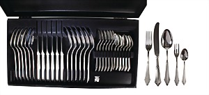 24 pieces cutlery, WMF fan pattern, silver 925/000 and silver-plated 90 plating, 6 spoon, lenght = 20.6 cm (4 of it silver-plated), 6 forks, lenght = 20.2 cm (silver), 6 knives, lenght = 23.5 cm (silver), 6 coffee-spoon, lenght = 15.7 cm (silver-plated) and 6 cake forks, lenght = 13.9 cm (silver), total 1.25 kg (without knives), as good as new!