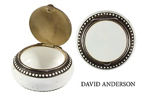 Kleine Pillen-Dose mit Scharnierdeckel, DAVID ANDERSON um 1900, Silber 925/000, sig. 925 Symbol (David Anderson). Außen weißes, transluzides Emaille (guillochiert), innnen weiß emailliert, die Kanten oben und am Boden mit weiß emailliertem Punktekranz, D = 40,0 mm, H = 18,2 mm. Kleine Punkte u. Außenrand mit dez. Abplatzern, schöner Handschmeichler !