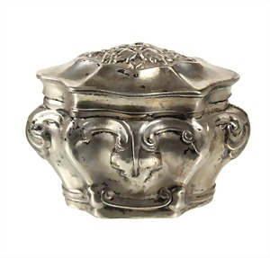 Kleine Pillen-Dose, Deutsch 2. Hälfte 19.Jhd., SILBER 800/000 (Stempel wohl später !), Korpus mit Akanthusblättern verziert, Scharnierdeckel, ca. 46,0 x 35,2 x 30,4 mm