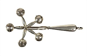 rattle around 1880/90, silver 800/000. signed ..S4FI, 5 rattles (clamps), rotatable on a wheel, diameter = 69.0 mm, handle with eye, lenght = c. 13.7 cm, used !