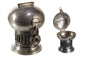unusual cigarette case, Hungary late 1930s, silver, spherical case, to the top columnar worked, hinged lid, inside lined with wood(3 compartments), small sticking out feet, sizes c. 22.5 x 17.3 cm, height = 8.0 cm, total 690 g, unusual !