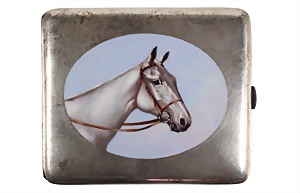 Zigarettenetui um 1910/20 wohl Pforzheim, ALPACCA, innen mit Resten alter Feuervergoldung, Emaille farbig bemalt, "PFERD" (Kopf) im Hintergrund blauer Himmel, ca. 101,0 x 84,6 x 17,7 mm, kräftige solide Ausführung !