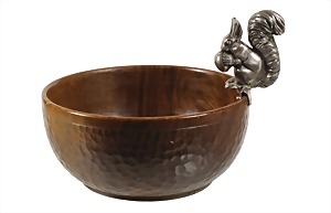 wooden bowl, VINTAGE middle of the 20th century, on the edge a squirrel with a nut, silver, signed RKK, plastic worked, shell: diameter = 13.0 cm