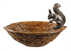 wooden bowl shaped like a nutshell, VINTAGE from the middle of the 20th century, on the edge a squirrel with a hazelnut, silver, plastic worked, oval shell: diameter = 26.2 x 16.8 cm