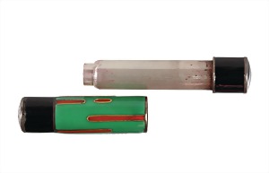 lipstick, ART-DECO 1920s/'30s, silver, black, green and red enameled (with small flake off parts), turn function, diameter = 11.3 mm, lenght = 51.7 mm, unusual !