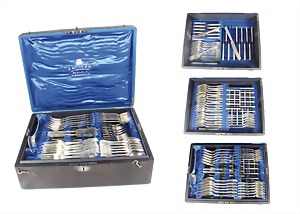 cutlery case H.MEYEN & CO BERLIN HOF-SILBERWARENFABRIK around 1880, silver 14 Lot (875/000), signed: H. MEYEN & Co. Spaten, 12 pieces with monogram SN or NS. 24 dinner forks lenght = 20.6 cm and 12 knives lenght = 25.2 cm, dessert: always 12 forks lenght = 17.3 cm, 12 knives lenght = 21,8, 12 spoon lenght = 18.2 cm, 12 coffe spoons lenght = 15.0 cm, 12 fruit knife lenght = 18.7 cm, 1 butter knife, 1 cheese knife and 1 big serving spoon lenght = 26.7 cm, total 4130 g (weighed without knives !). handmade original suitcase, covered with leather, suitcase size: 49.0 x 37.0 x 17.5 cm