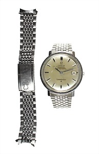 Herren-Armbanduhr, OMEGA Constellation, Automatik Chronometer, Zent. Sek., Strich Index, Dat. auf 3 Uhr, verschr. Boden, D = 35,6 mm, Werk rotvergoldet, Kal: OMEGA 561, Stahlband mit orig. Faltschließe, 1 orig. Stahlband extra ! benötigt neue Dichtung, Uhr läuft !