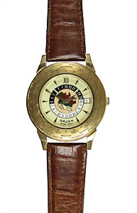 men's wristwatch, GRUEN, World Time Watch 1990-1999, quartz, steel gold plated, central second, date on 3 o' clock, diameter = 40.0 mm, standard N° 192-FE7224 GR1754, leather watchstrap with pin buckle, not tested