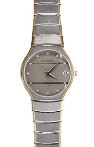 Herren-Armbanduhr, BUCHERER Schweiz, Stahl/Gold, Quarz, Zentralsek., Dat. auf 3 Uhr, Std. Index mit Diamanten besetzt, verschr. Boden, D = 31,0 mm, N° 256.512, L = 19,0 cm, ungeprüft !