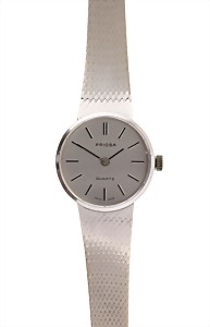 ladies watch, PRIOSA, quartz, white gold 585/000, stick index, pressed bottom, diameter = c. 24.3 mm, lenght = 16.2 cm, total 32.9 g, clock is running !