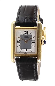 Damen-Armbanduhr, CARTIER TANK, Quarz, Silber verg. (20 mik.), sig. Cartier Paris, Röm./Strichindex, Schmuckkrone, Boden 8-fach verschraubt, Gehäuse ca. 20,5 x 28,0 mm, orig. Faltschließe, berieben, Uhr läuft !