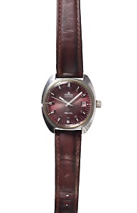 Herren-Armbanduhr, VINTAGE, EDOX DELPHIN, Automatik, Stahl, rot-braunes Zifferblatt im Farbverlauf, aufgesetzte Stundenbalken mit Leuchtmasse, zent. Sek., Dat. auf 3 Uhr, verschr. Boden, Cal. ETA 2783, Ref. Nr. 200554, Lederband mit Dornschließe, Uhr läuft !