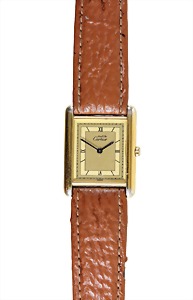 Ladies' wristwatch, CARTIER Paris, SERIE: tank, quartz, silver 925/000 gold plated (20 Mic.), shows the hours and minutes, blued hand, bottom eightfold screwed, decorative crown (strone is missing), c. 30.5 x 22.6 mm, N° 77838, 6 81008, sharkskin strap with pin buckle, worn, not tested !