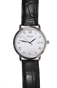 Herren-Armbanduhr, MONTBLANC Tradition, Mitte 1990er Jahre, Stahl, Automatik, weiß. Ziffernbl., röm. Index, Zent. Sekunde, Dat. auf 3 Uhr, Saphirglas, D = 40,0 mm, Glasboden, Kal. MB 24.17, orig. Lederarmband mit Dornschließe, Etui u. Schatulle, Uhr läuft ! (ungetragen)