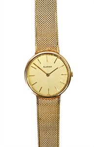men's wristwatch, ALPINA, manual winding, yellow gold 585/000,stick index, pressed bottom, Kal. P 7001, very flat mechanism by Peseux (afterwards ETA), milanese watch band with folding clasp, lenght = c. 18.0 cm, total 63.2 g, clock is running !