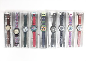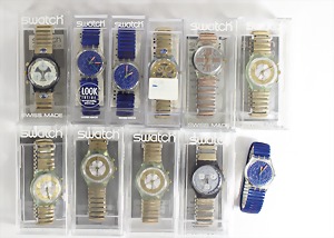 Lot: 10 Swatchuhren, Quarz, Chronograph, (30 m wasserdicht), mit Originalschatullen, ungetragen, ungeprüft !