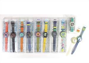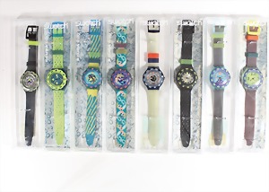 lot: 8 Swatch clocks, quartz, SCUBA/SCUBA 200, (200 m waterproof), and others BOMBOLA, BERMUDA TRIANGLE, BORA BORA, BLACK WAVE, SILVER TRACE, SWORD FISH, SAILERS JOY MEERJUNGFRAU, SPRAY UP, with original caskets, unworn, unchecked !
