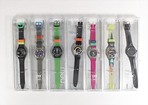 lot: 7 Swatch clocks, quartz, STOP-WATCH, (30 m waterproof), with original caskets, unworn, unchecked !
