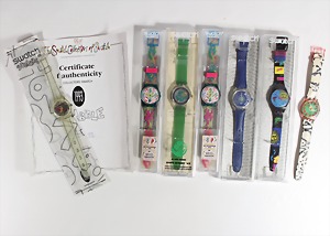 Lot: 7 Swatchuhren, 6 Quarz, davon 1 Automatik, 2 MUSICCAL, 1 SCRIBBLE…., mit 6 Originalschatullen, ungetragen, ungeprüft !