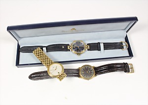 men's and ladies' wristwatch, steel/gold, quartz, signed Maurice Lacroix, 1 x Calypso, central second, date on 6 o'clock, ETA 955.412, original bracelet, 1 x black clockface, date on 6 o'clock, 1 x 92290 Date, date on 6 o'clock, gold ribbon with folding clasp, unchecked !