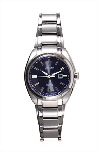 Ladies' wristwatch, steel, quartz, signed CITICEN, blue clockface, central second, stick index, date on 3 o'clock, screwed bottom, diameter = 33.2 mm, steel strap with folding clasp, (spare links), clock is in need of a new battery !