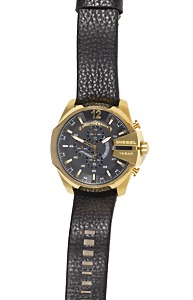 men's wristwatch, DIESEL Montre Megachief DZ 4344, chronograph, quartz, gold colored, diameter = 53.4 mm (without crown), screwed floor, leather watchstrap with pin buckle, original box, clock is running !