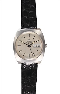 Herren-Armbanduhr, VINTAGE Ende 1970er Jahre, BULOVA ACCUTRON (Stimmgabelwerk), Quarz, Stahl, silberfarbenes Ziffernb., Strichindex, Zentralsek., Tag/Dat., tonneauförmiges Gehäuse, D = 36,0 mm, geschr. Boden, neutrales Lederband mi BULOVA Dornschließe, ungetragen, Uhr läuft (neue Batterie)
