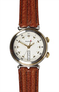 men's wristwatch with alarm clock, PEQUIGNET, France 1990s, self-winding, stainless steel partly gilded, cream-colored enamel clockface, Roman numbers, luminous index, centre second, indication of hours, minutes, day, date and wake-up time, at the side 2 onion crowns, pressed bottom, diameter = c. 38.5 mm, glazed on both sides, central rotor, gold plated mechanism, Kal. AS 5008, No° 4113313, original leather watchstrap with pin buckle, wasn't worn, good/very good condition, clock is running !
