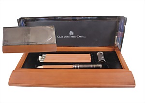 writing instrument, GRAF VON FABER KASTELLfor the company EBEL, casket made of wood (cedar ?), pencil holder, silver-plated with pin (plus 4 spare pens), 1 pencil sharpener, silver-plated hinged lid , high-quality version, sizes c. 25.7 x 13.0 x 2.5 cm
