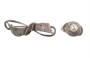 Lot: Ring u. Brosche THEODOR FAHRNER Pforzheim 1940/50er Jahre (Filigranschmuck), Silber 925/000, Ring: sig. TF 925 FAHRNER, Markasite u. Perle, RW ca. 60; Brosche: sig. TF 925 ORIGINAL FAHRNER, L = 51,7 mm. Literatur bei Arnoldsche THEODOR FAHRNER SCHMUCK, Filigranschmuck S. 229