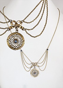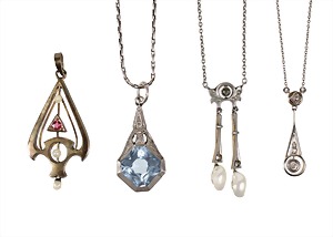 lot: 1 pendant and 3 necklaces from 1900 -1940, pendant, art nouveau around 1900, yellow gold 585/000, signed AM, small red stone, 3 pieces natural pearls, 1 necklace (plated pendant), with markasites and 2 hanging pearls, length = 43.5 cm, 1 necklace, pendant in yellow gold 750/000 (tested), 1 diamond and 3 small rose cut diamonds white, necklace white, length = 44 cm, 1 necklace, ART-DECO 1930/40,silver 835/000, with aquamarine-colored stone, length = 45 cm, with safety chain a little journey through time!